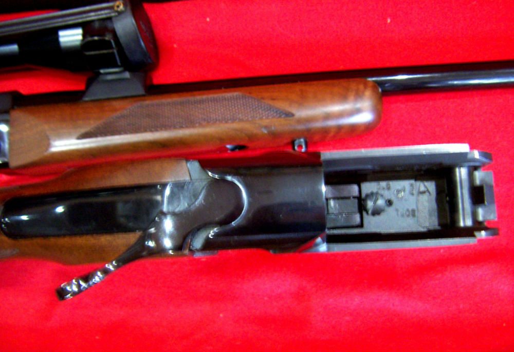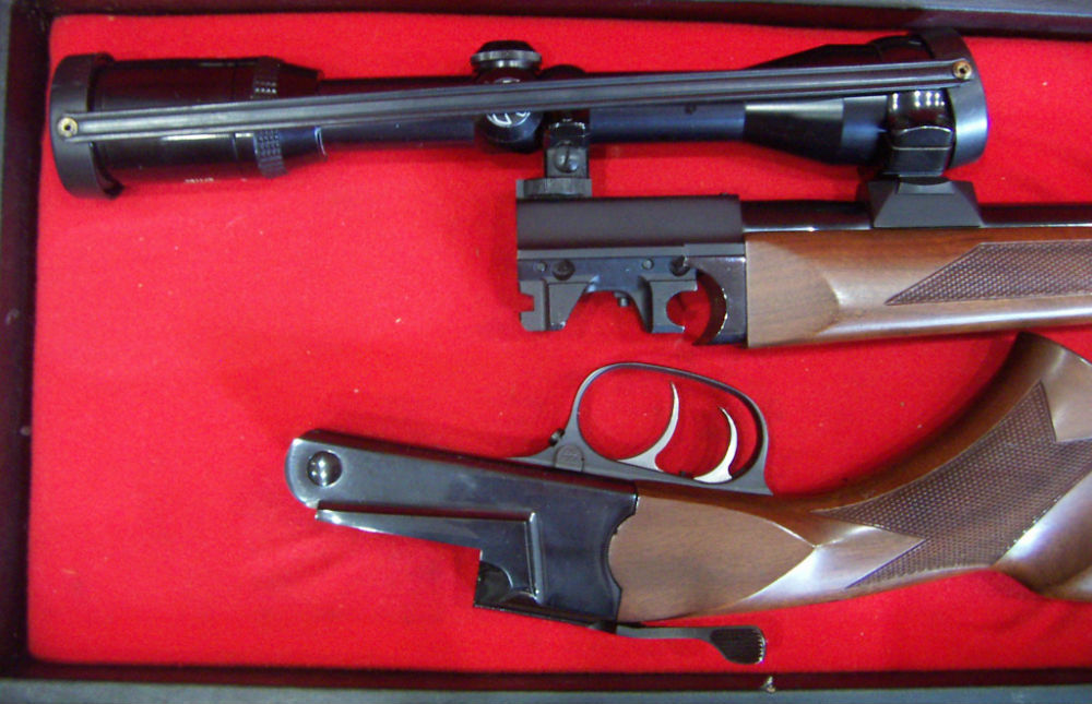 Rifle monotiro Thompson, en calibre 243 W, 46 cm de cañón con rosca, con doble gatillo (gatillo al pelo), monturas Apel originales, visor Zeiss Diavari C 3-9×36, en perfecto estado. Se entrega con maletín.